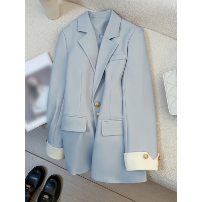 Plus Size, Women's Plus Size Elegant Golden Button Blazer - Solid Color Office Jacket with Fake Pockets